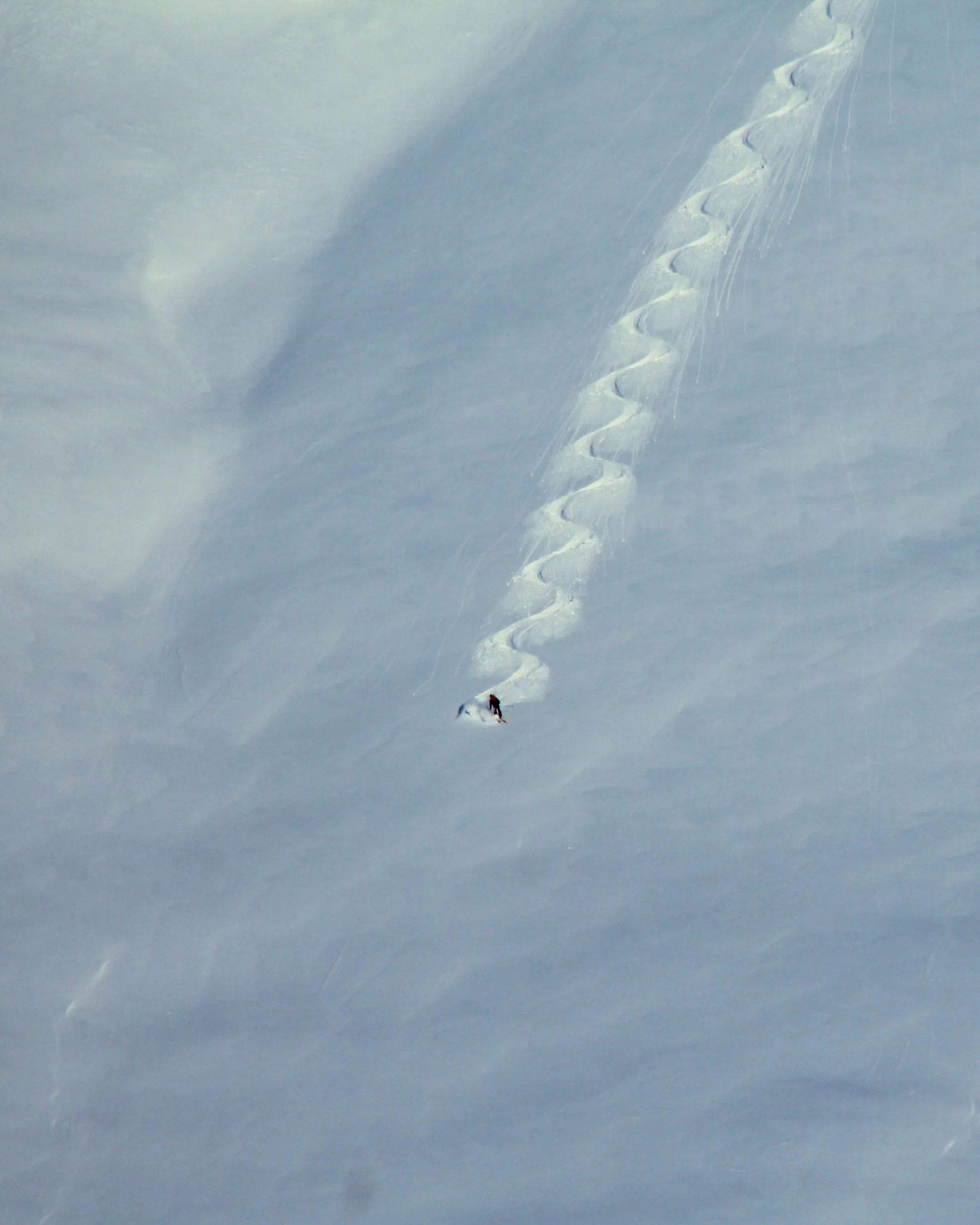 Looking back at the slope you’ve just come down, take a second to analyse the way the snow sprayed as you used it to redirect across the mountain towards the next turn. Does it spread out evenly through out the arc of your track or has it all gathered down hill after the apex of each turn?